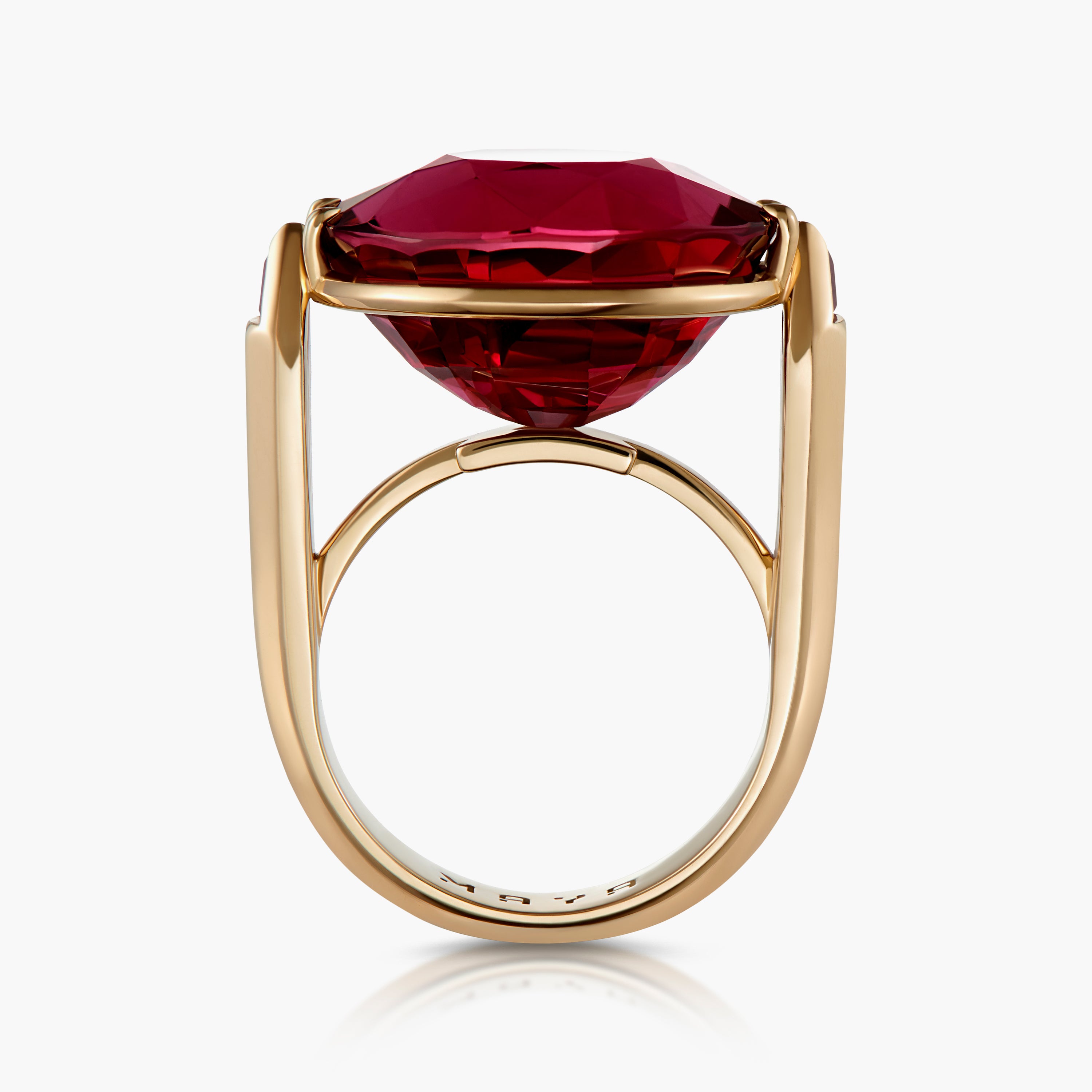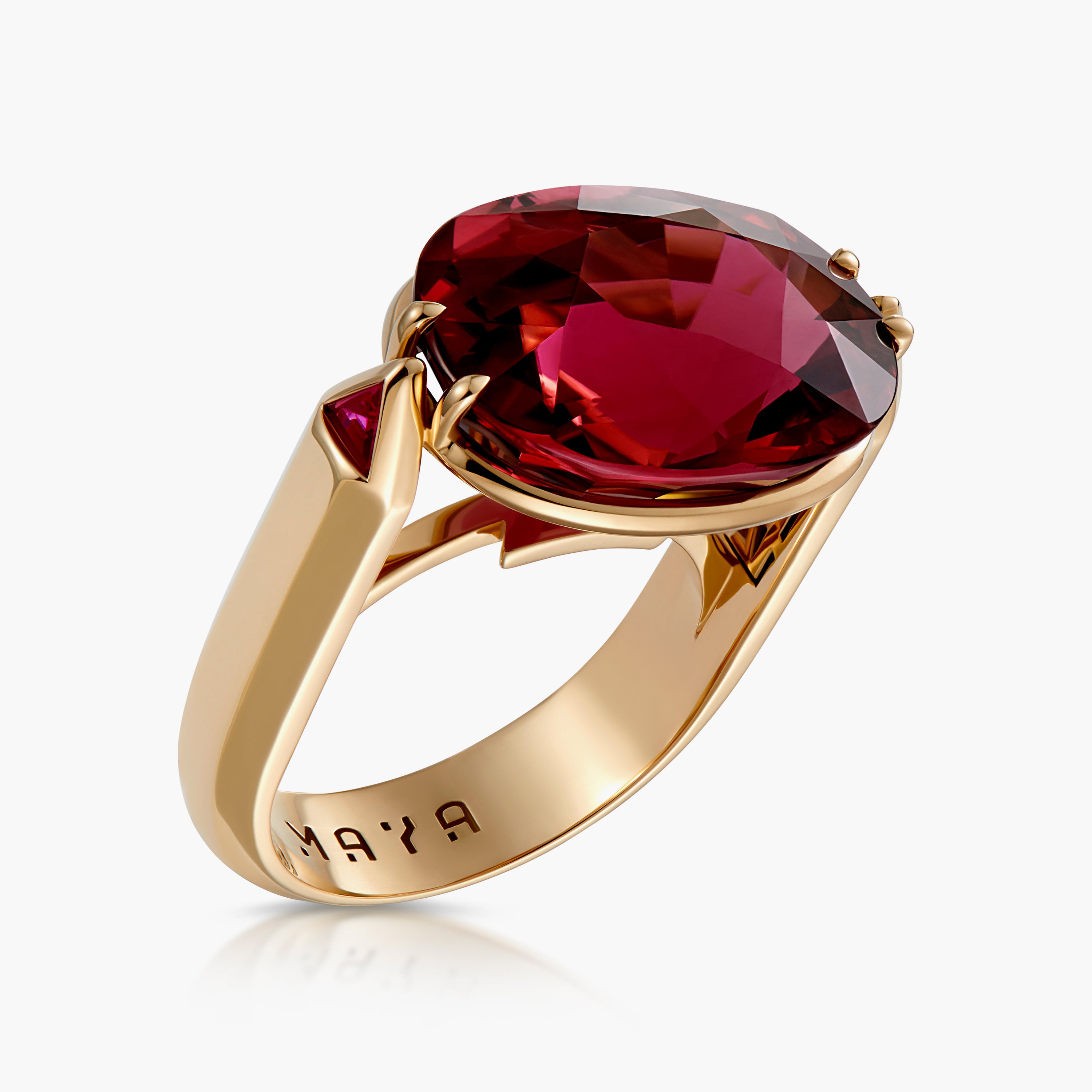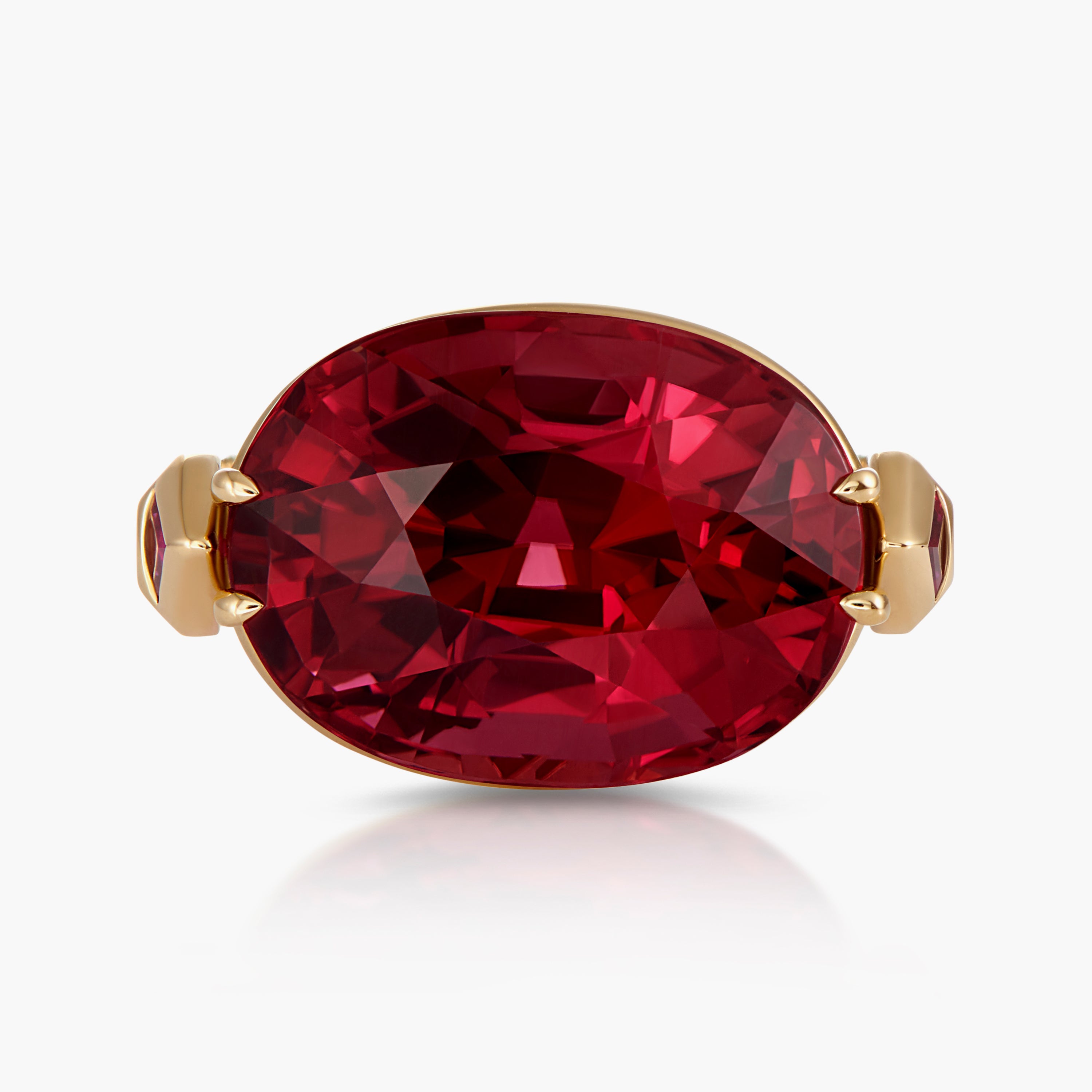 18ct yellow gold Tesla ring with a bespoke oval-cut Rubellite, which is flanked by two pencil designs, each with a Maya cut ruby.