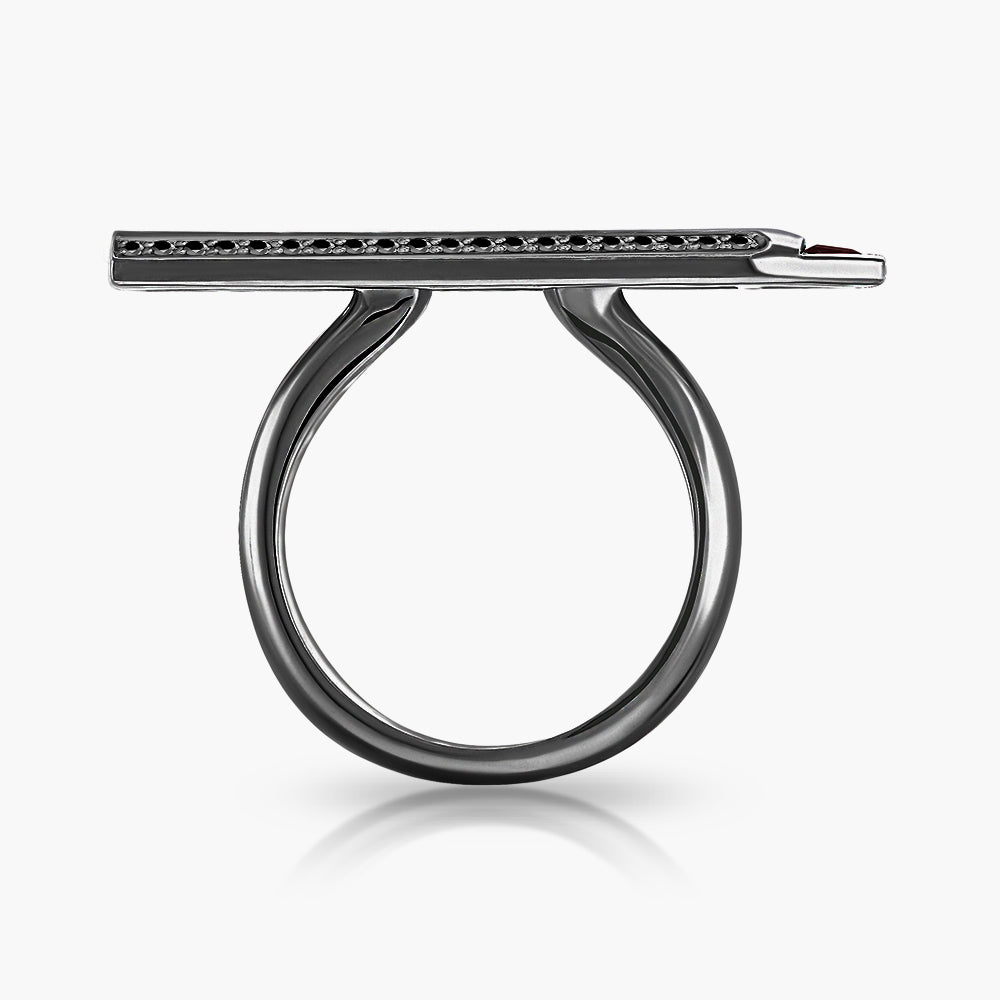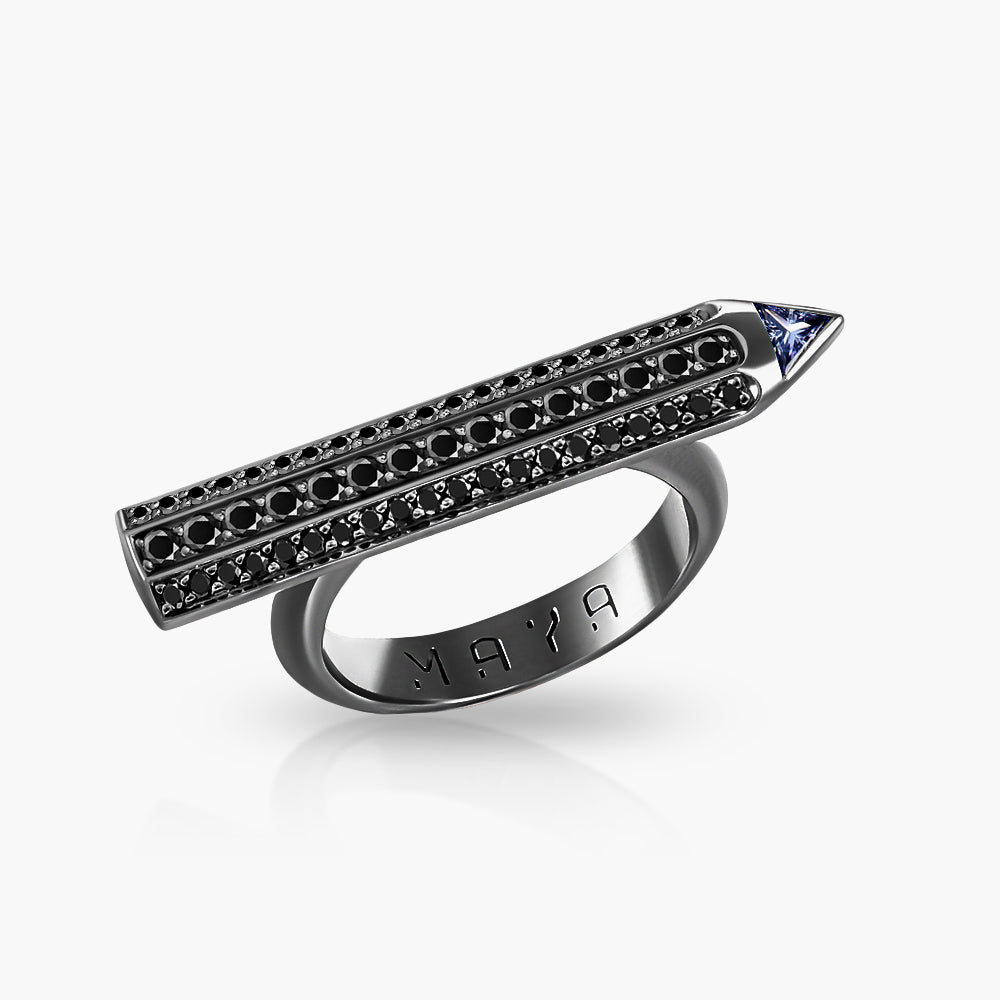 18ct black rhodium pencil ring, with black diamonds, and Maya cut tanzanite. Named after the rebellious Alice Cooper song, School's Out for Summer.