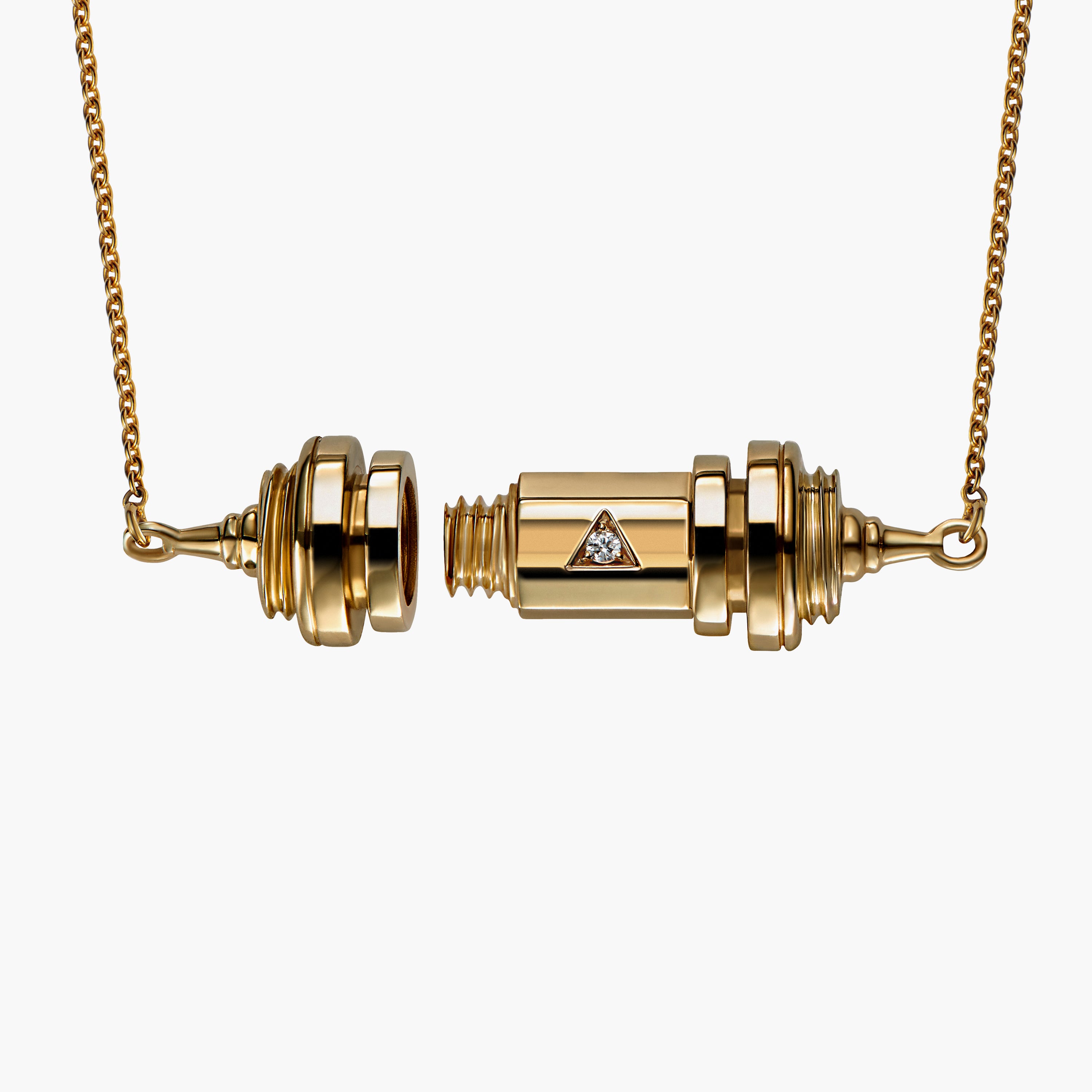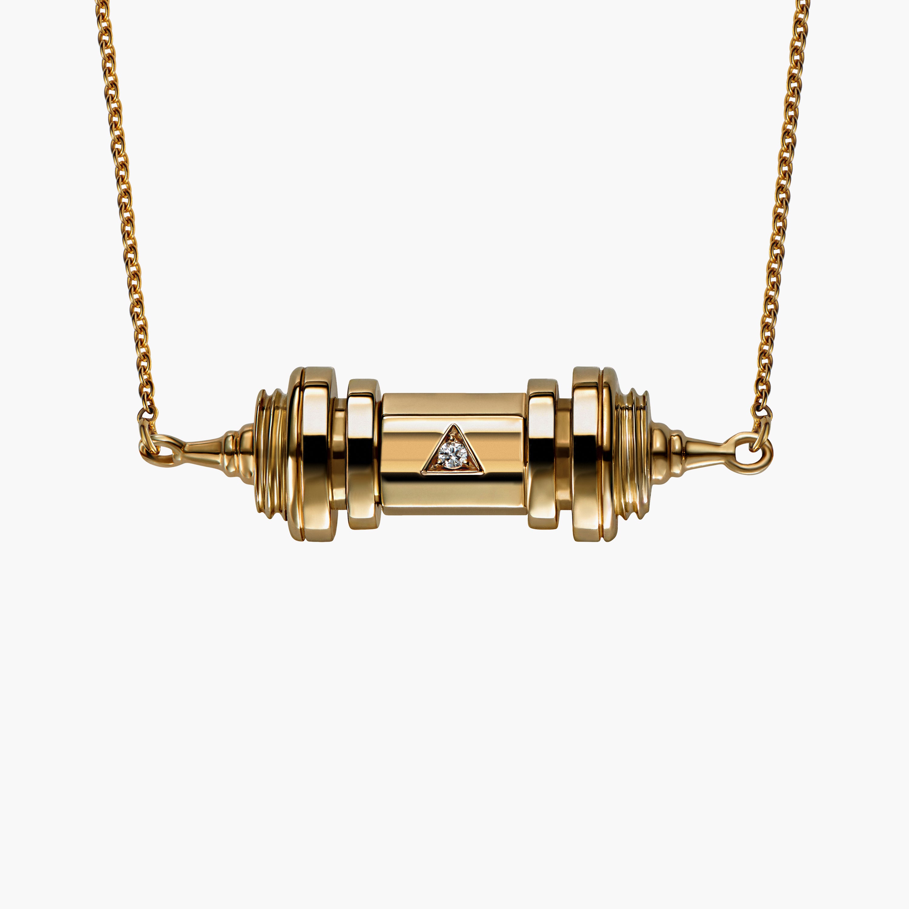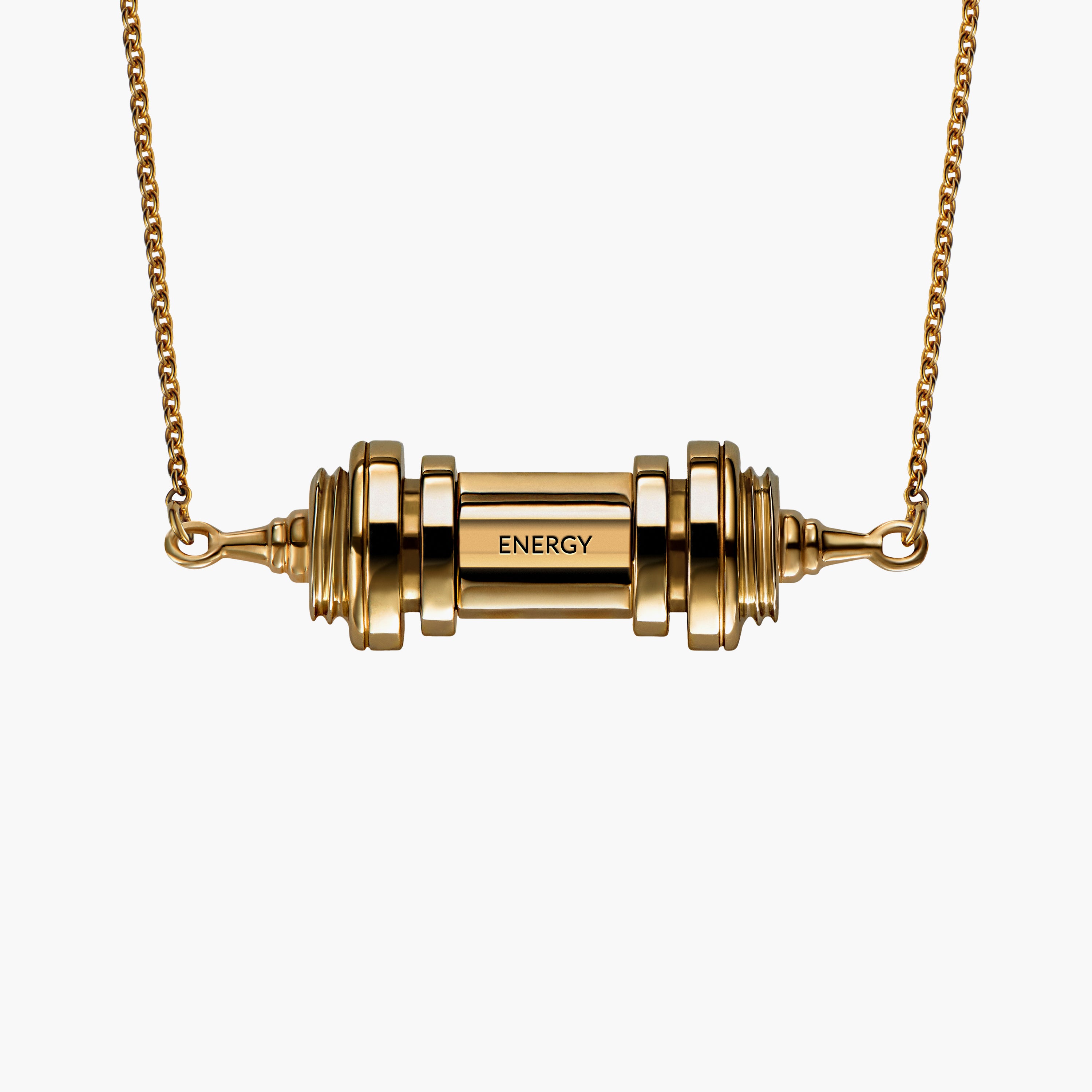 18ct yellow gold energy wheel pendant, with a glittering round-cut diamond and the word ‘energy’ emblazoned into the back.