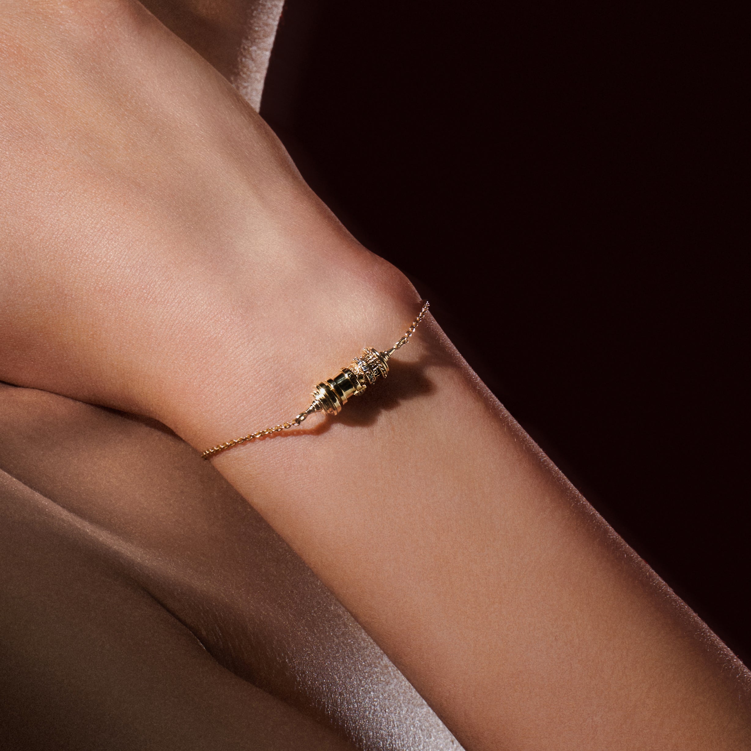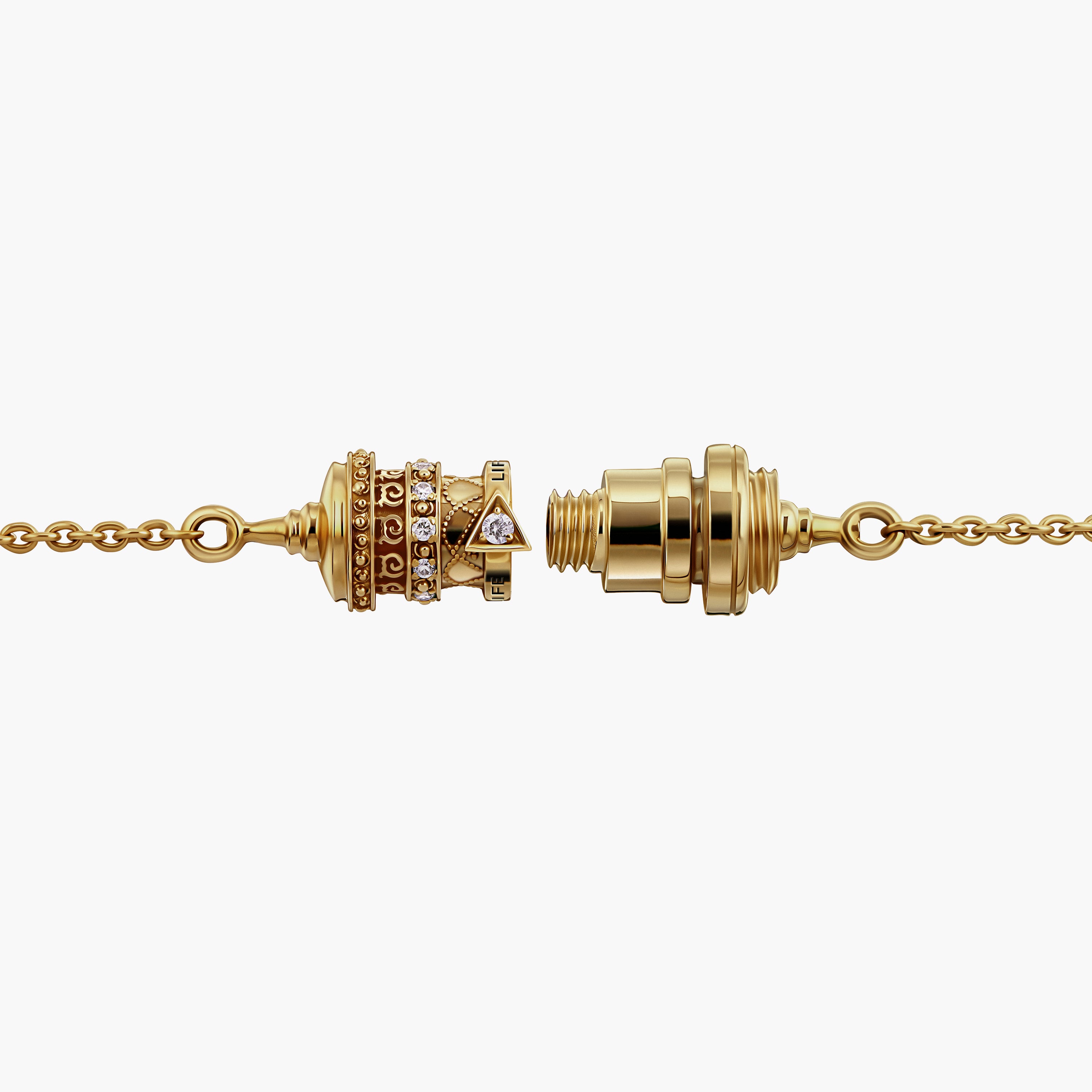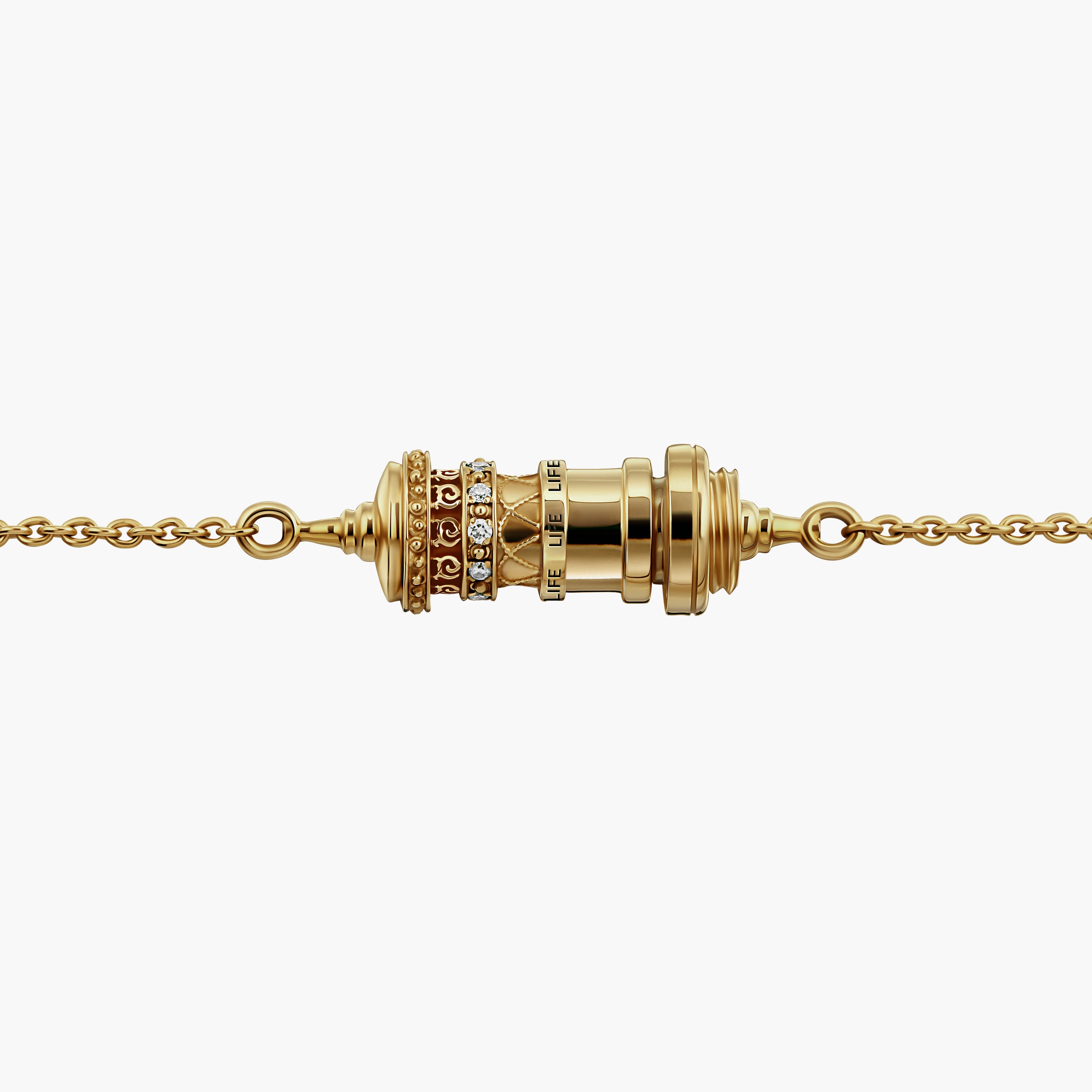 14ct yellow gold life wheel bracelet, with intricate half and half detailing, and a glittering round-cut diamonds.