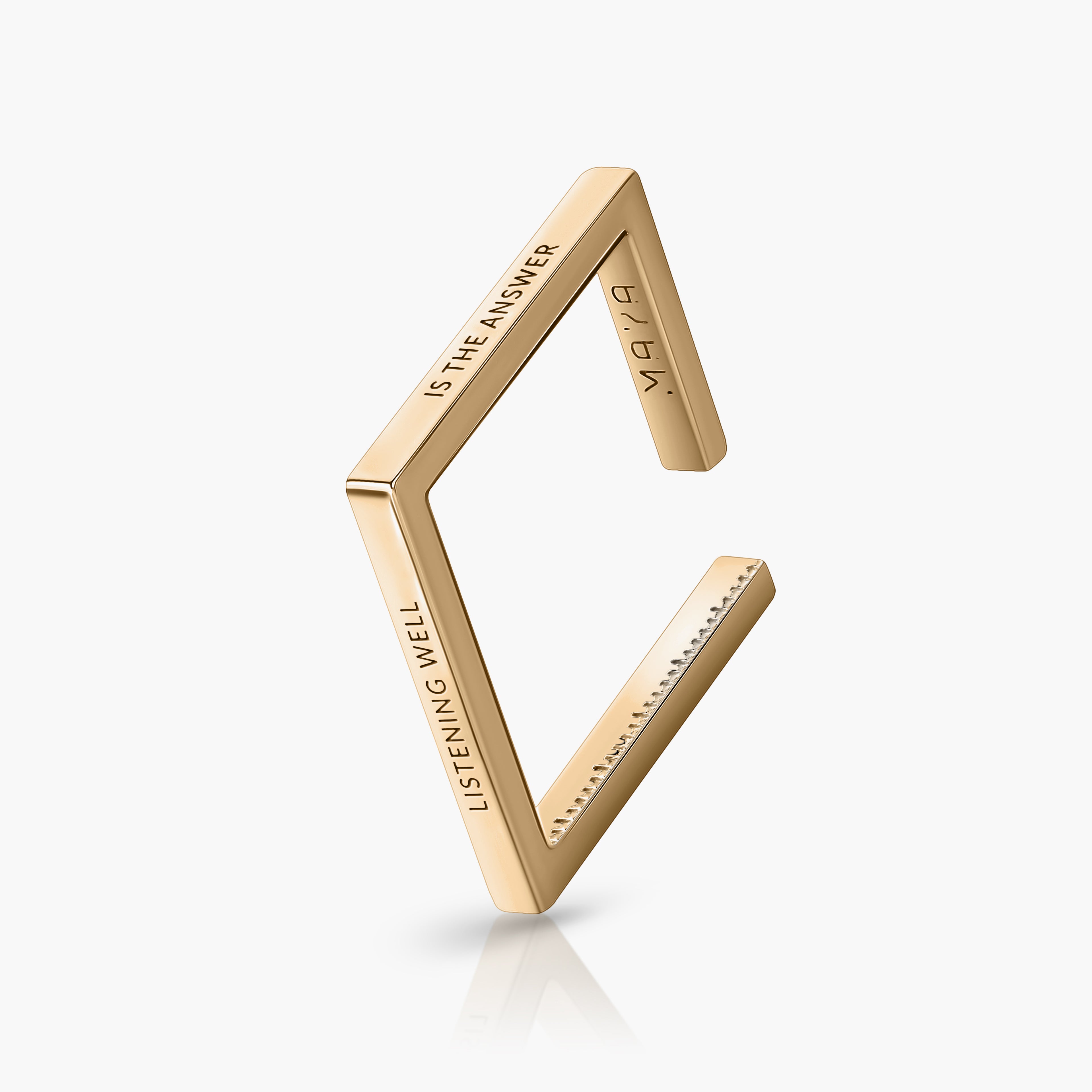 Each piece of this interchangeable design features the hash marks seen on a Set Square. It’s also inscribed with the words: “Listening well is the answer,” to remind the wearer to listen to themselves more deeply when making important decisions in life.