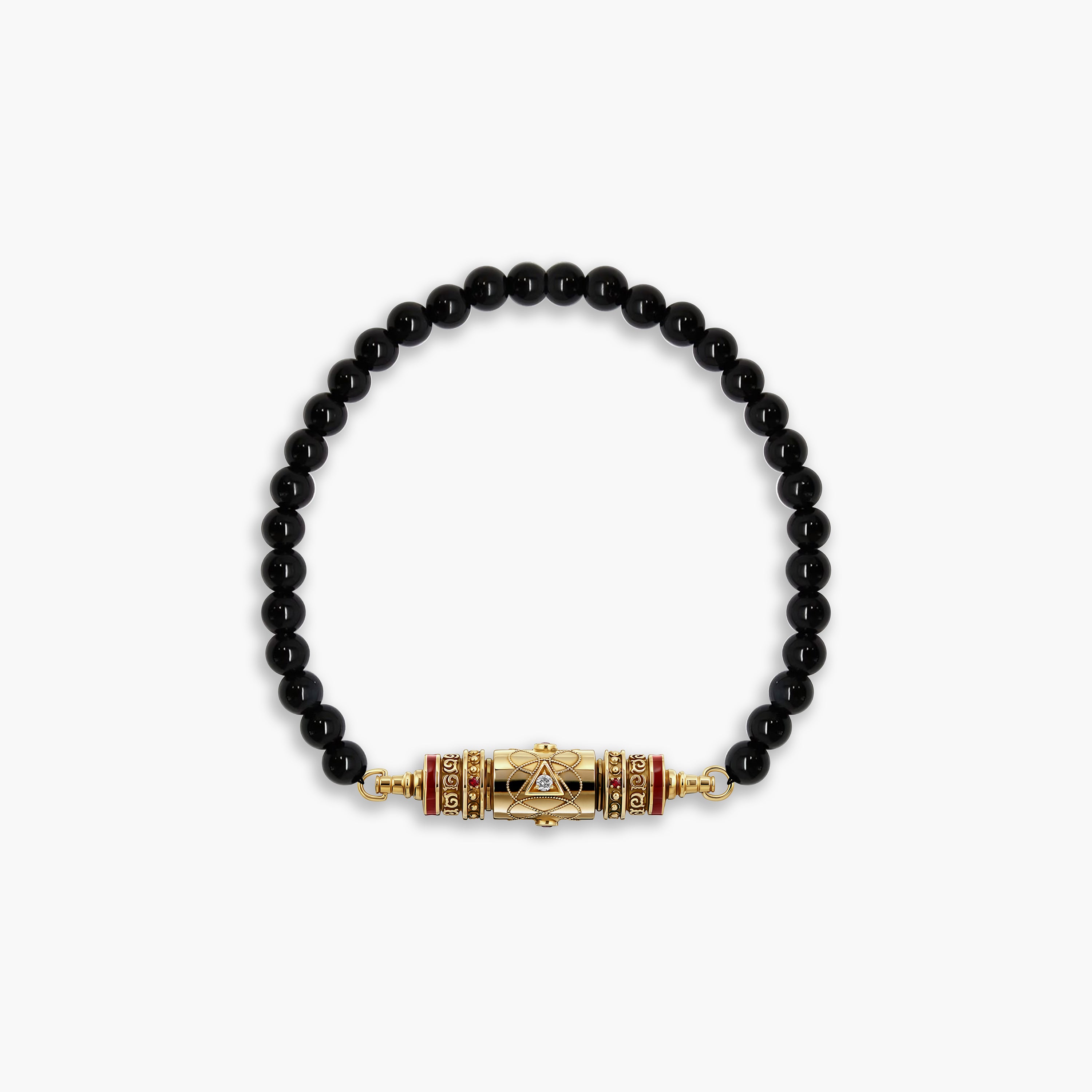 14ct yellow gold prayer wheel bracelet, with intricate detailing, red enamel, burmese rubies, and glittering round-cut diamonds. This piece is available with black Onyx beads.