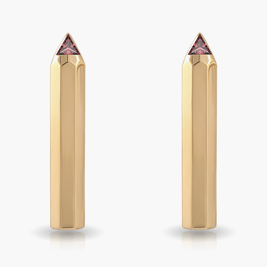 18ct yellow gold pencil earrings, with Maya cut burmese rubies. Named after the rebellious Alice Cooper song, School's Out for Summer.