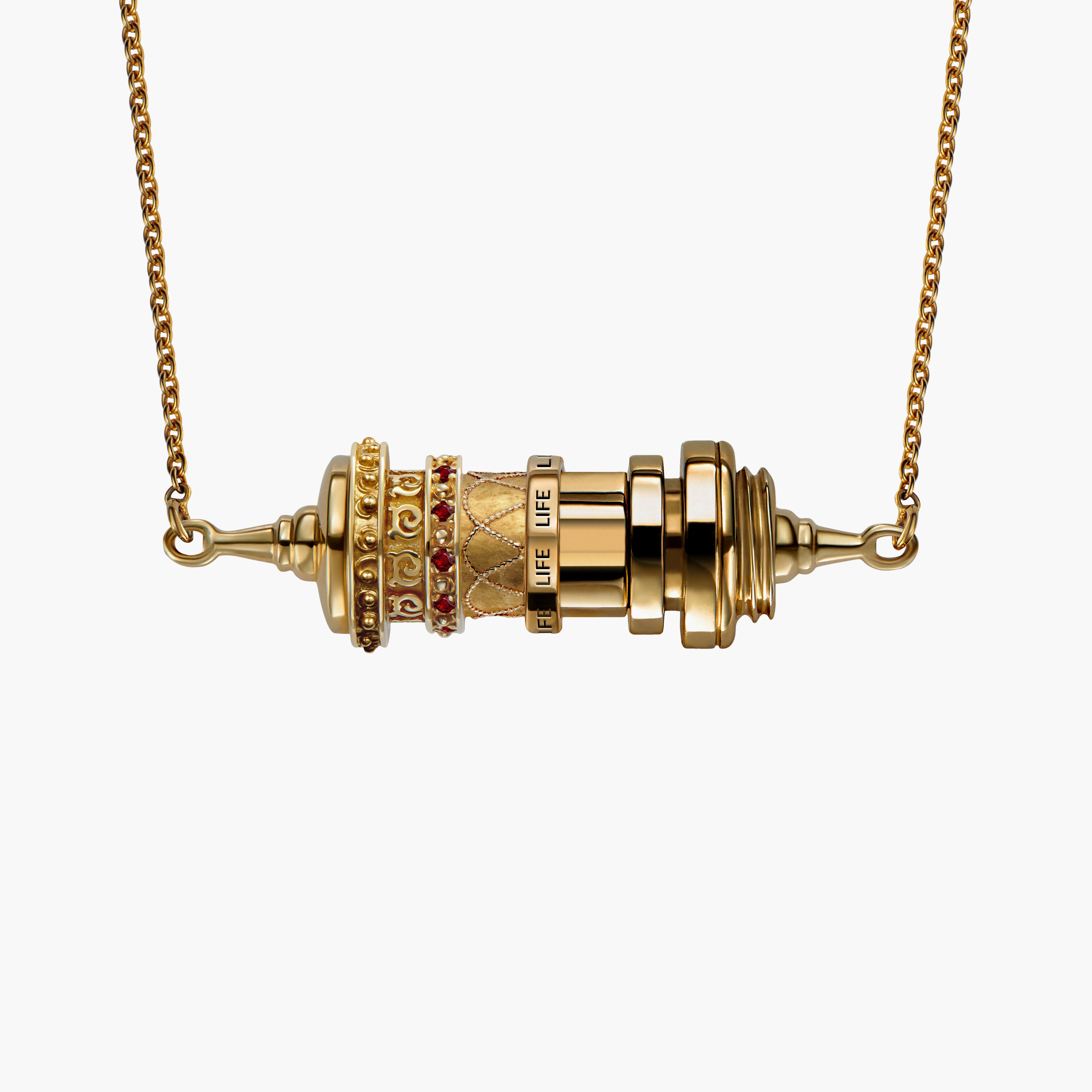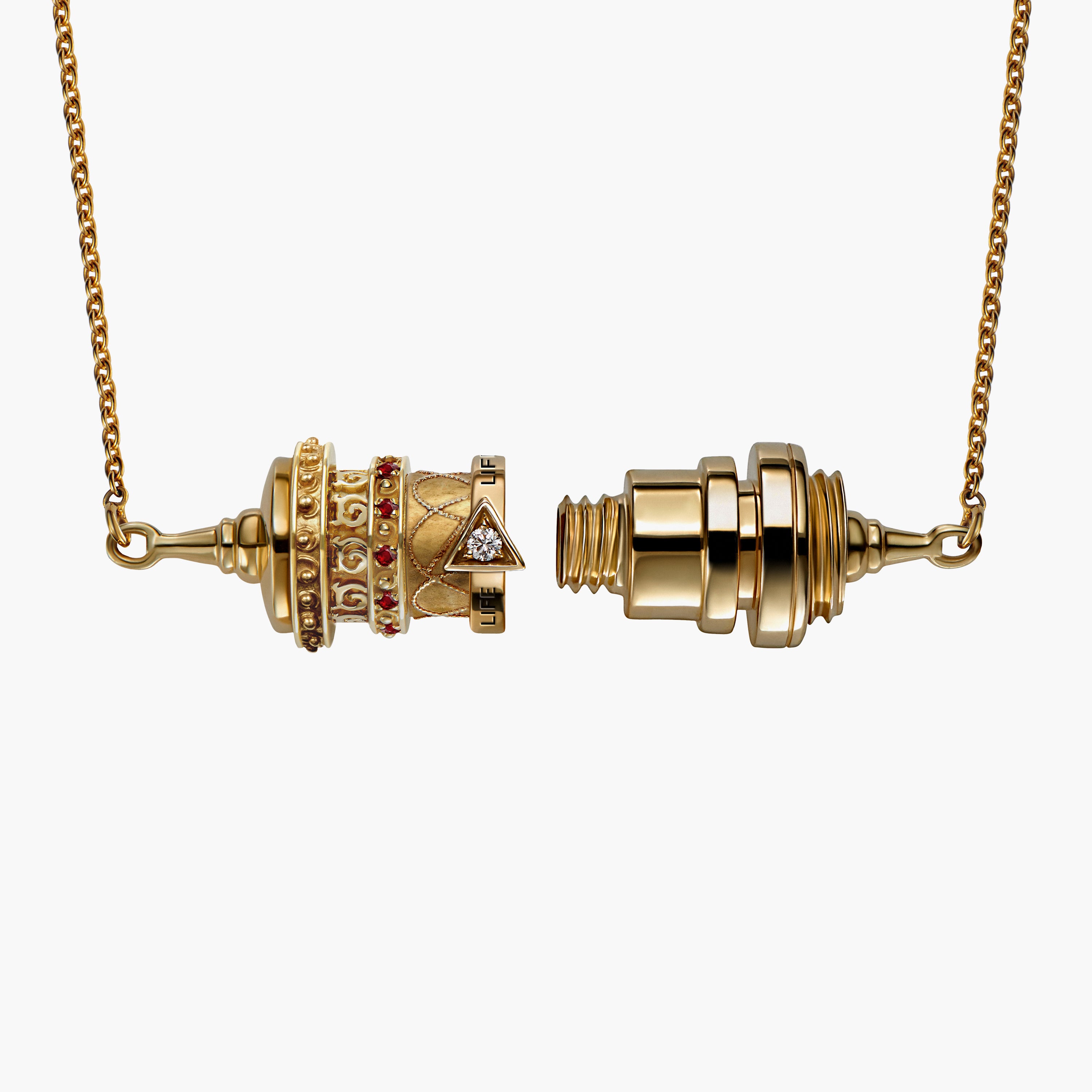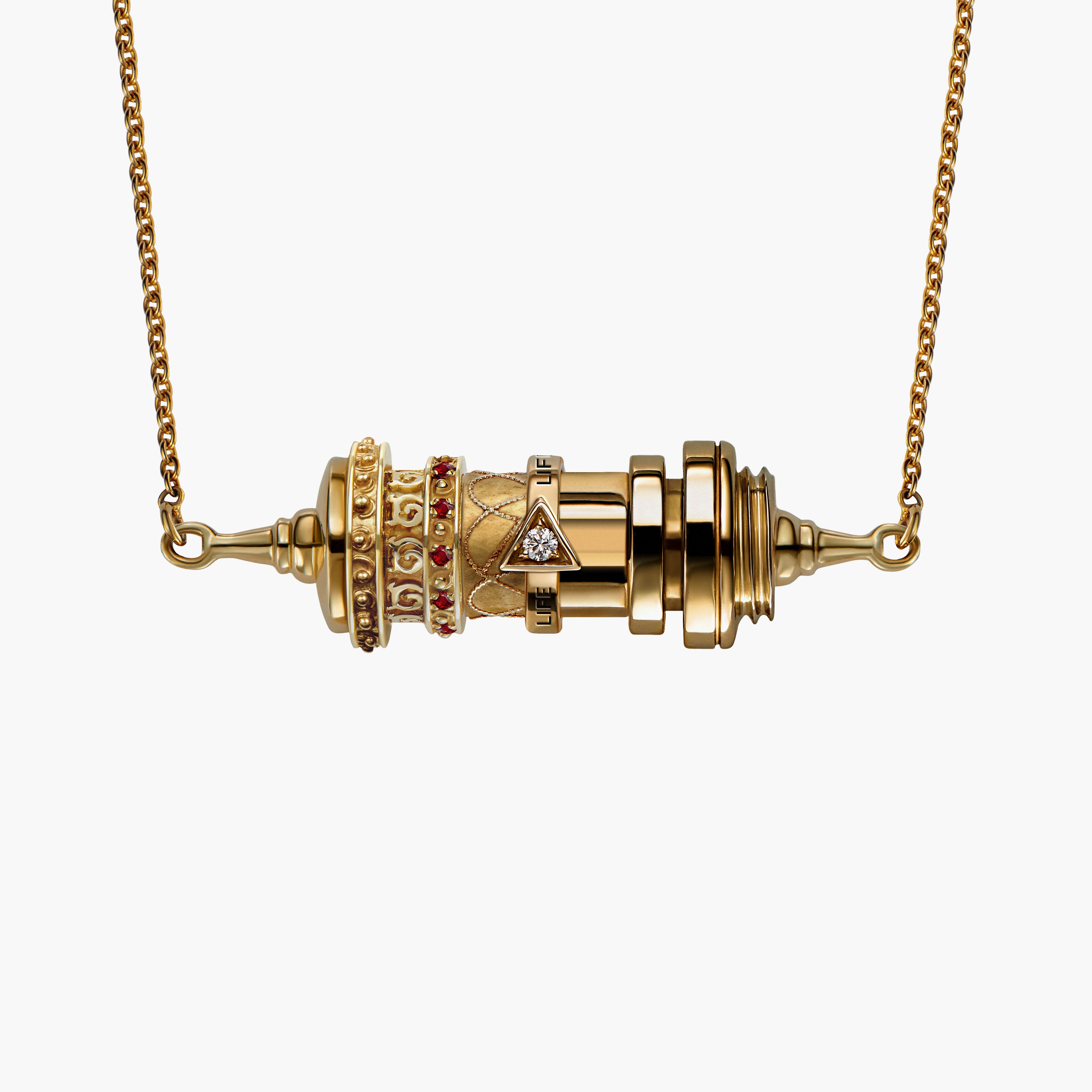 18ct yellow gold life wheel pendant, with intricate half and half detailing, burmese rubies and a glittering round-cut diamond.