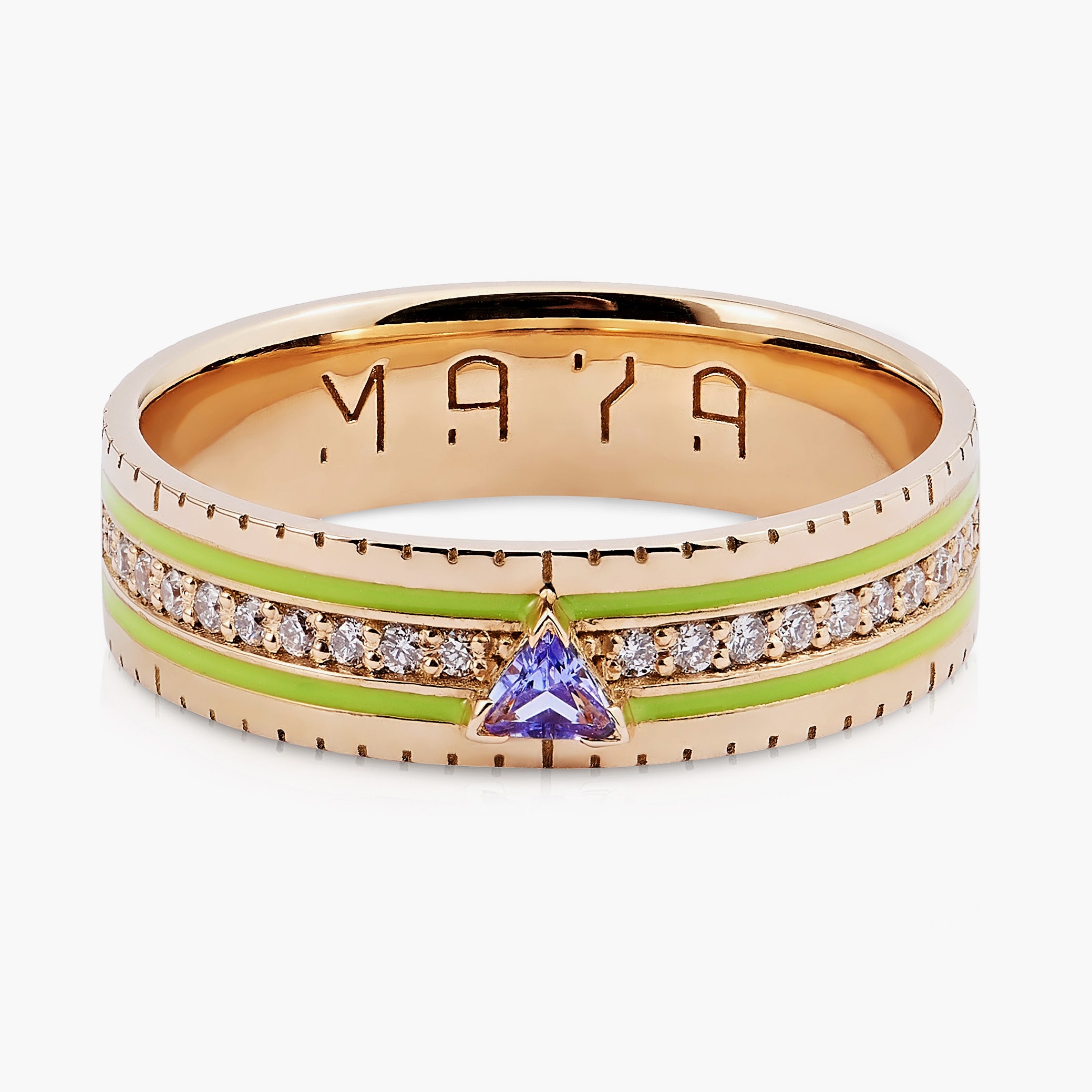 18ct yellow gold ruler ring, with neon yellow enamel, glittering diamonds, and a Maya cut tanzanite. Named after the rebellious Alice Cooper song, School's Out for Summer.
