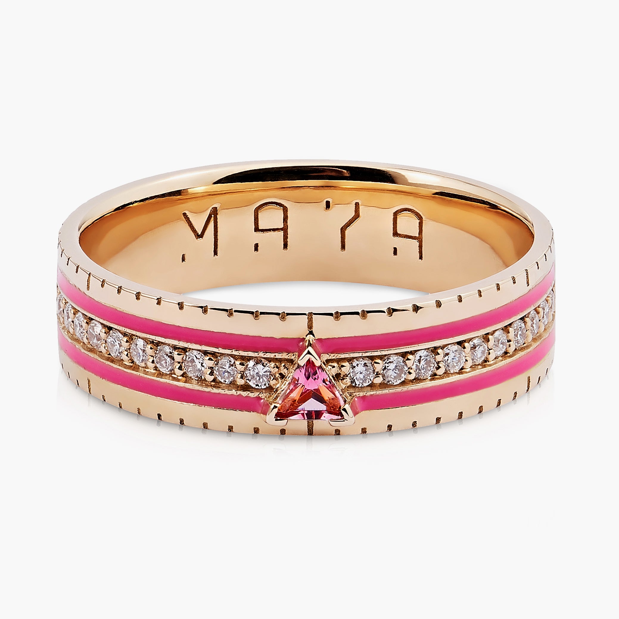 18ct yellow gold ruler ring, with neon pink enamel, glittering diamonds, and a Maya cut pink tourmaline. Named after the rebellious Alice Cooper song, School's Out for Summer.