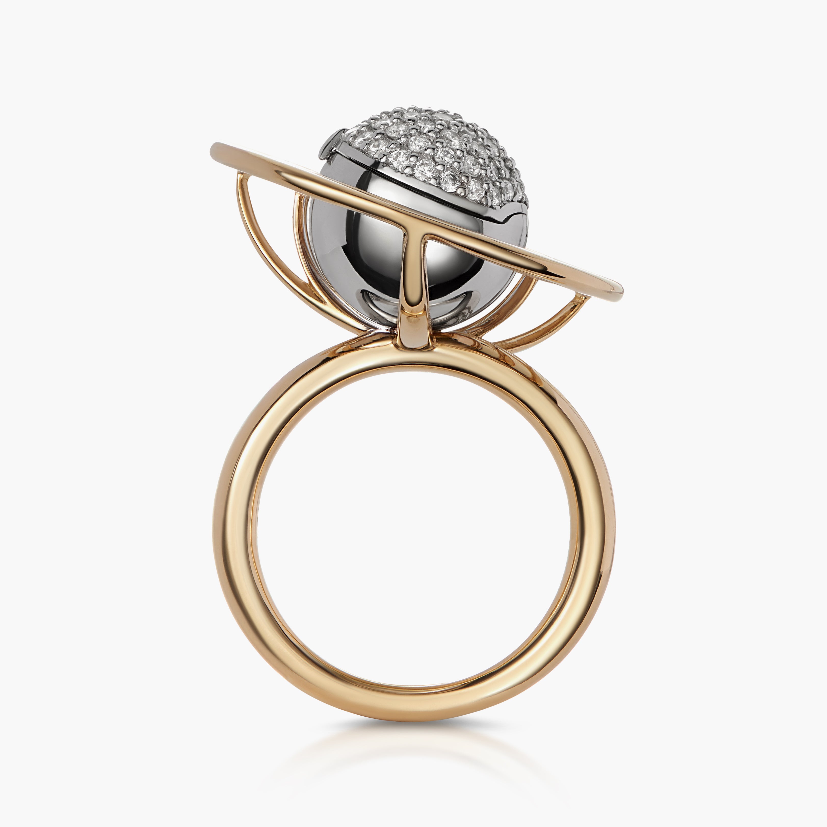 The central planet, which is encrusted with diamonds, opens up to reveal a secret space inside, while the Maya cut diamond, which freely orbits on the outer gold rings, represents the Maia star from the Taurus constellation.