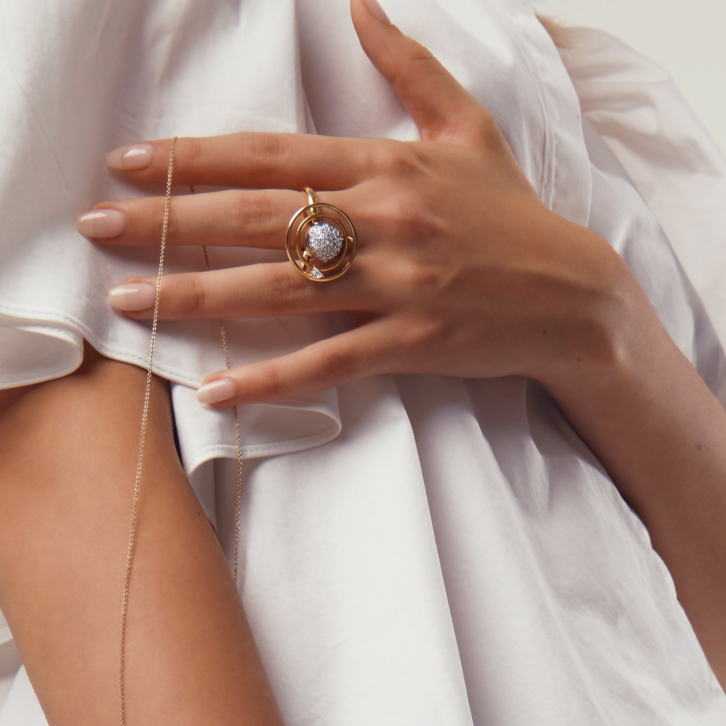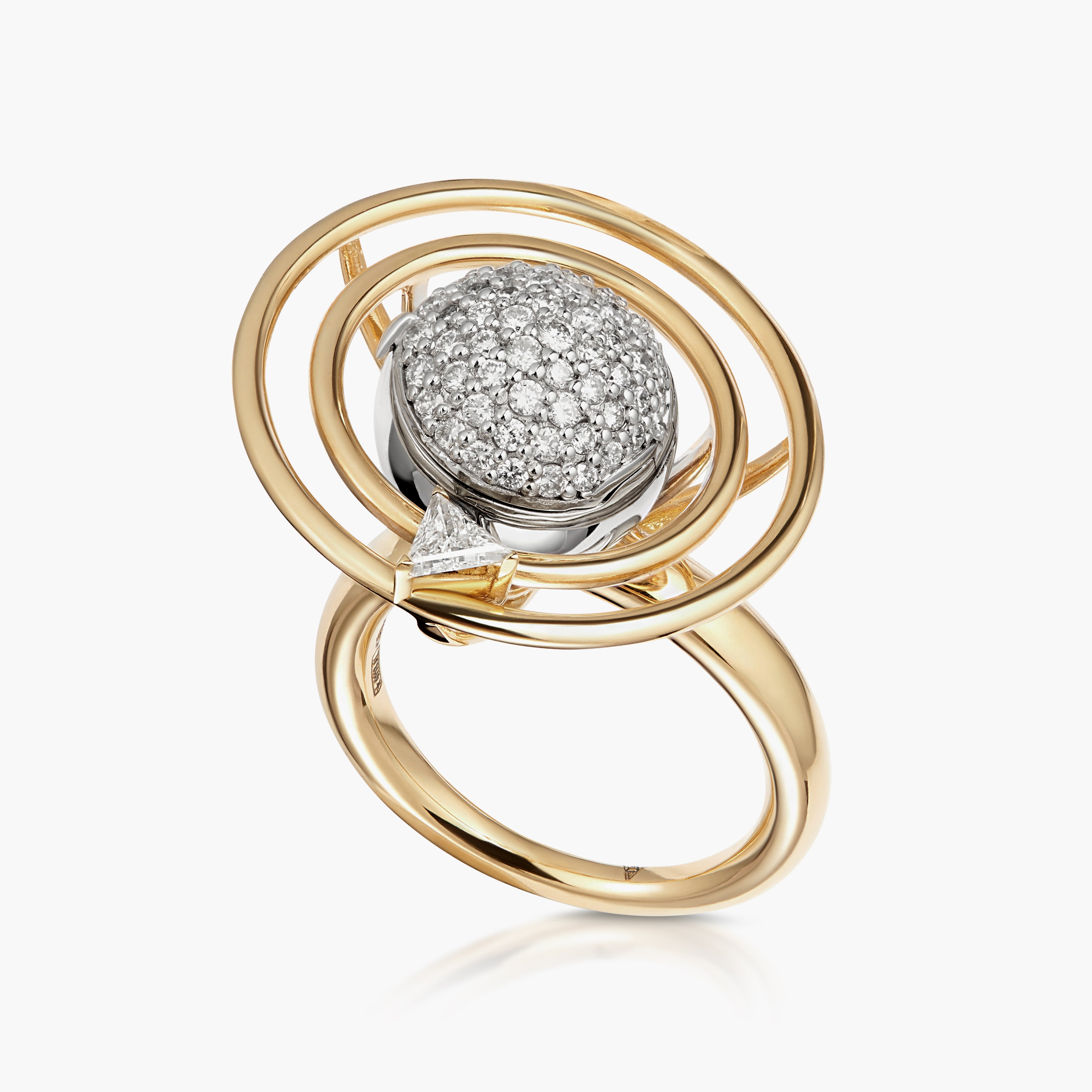 18ct yellow gold Saturn ring, with glittering diamonds, including one in our signature Maya cut.