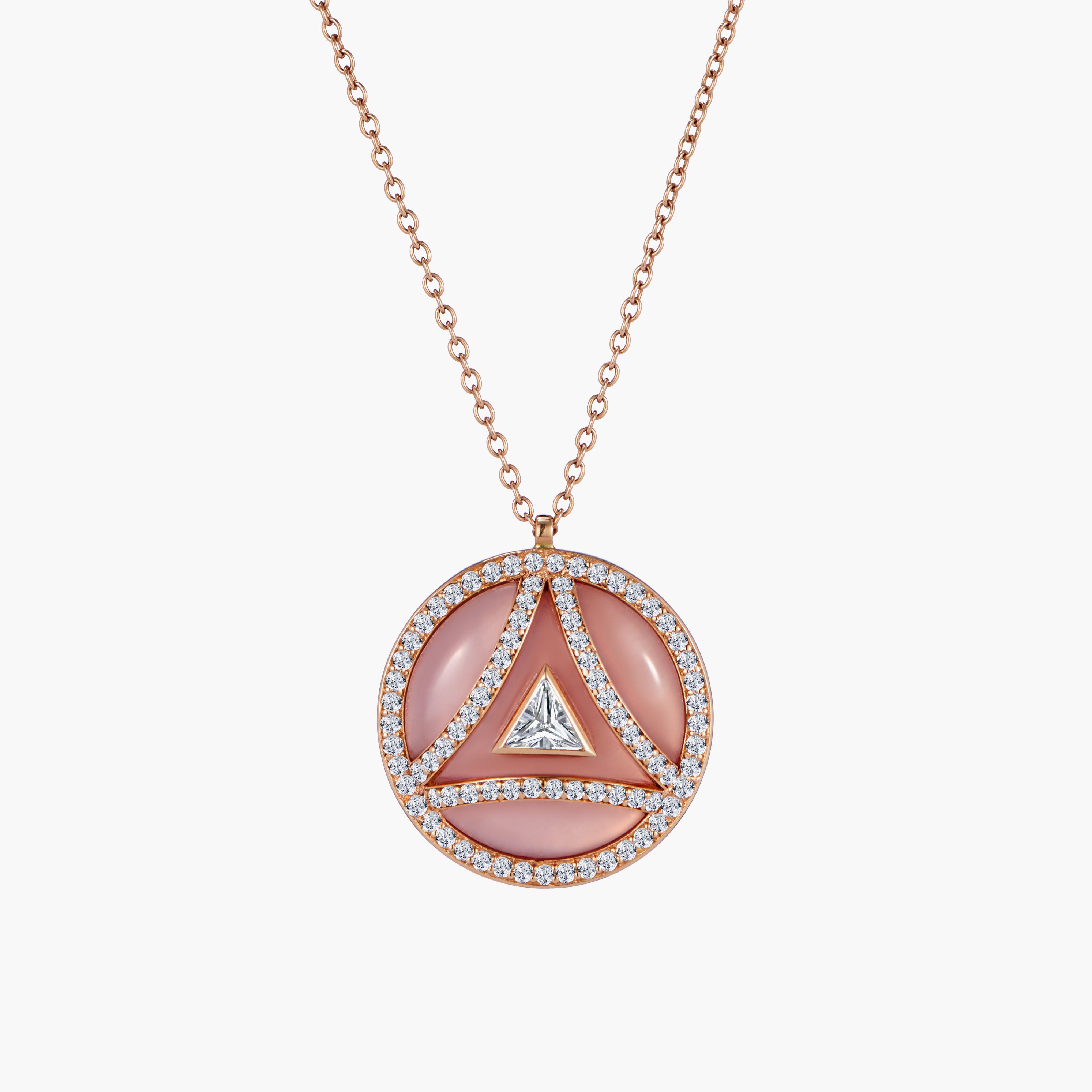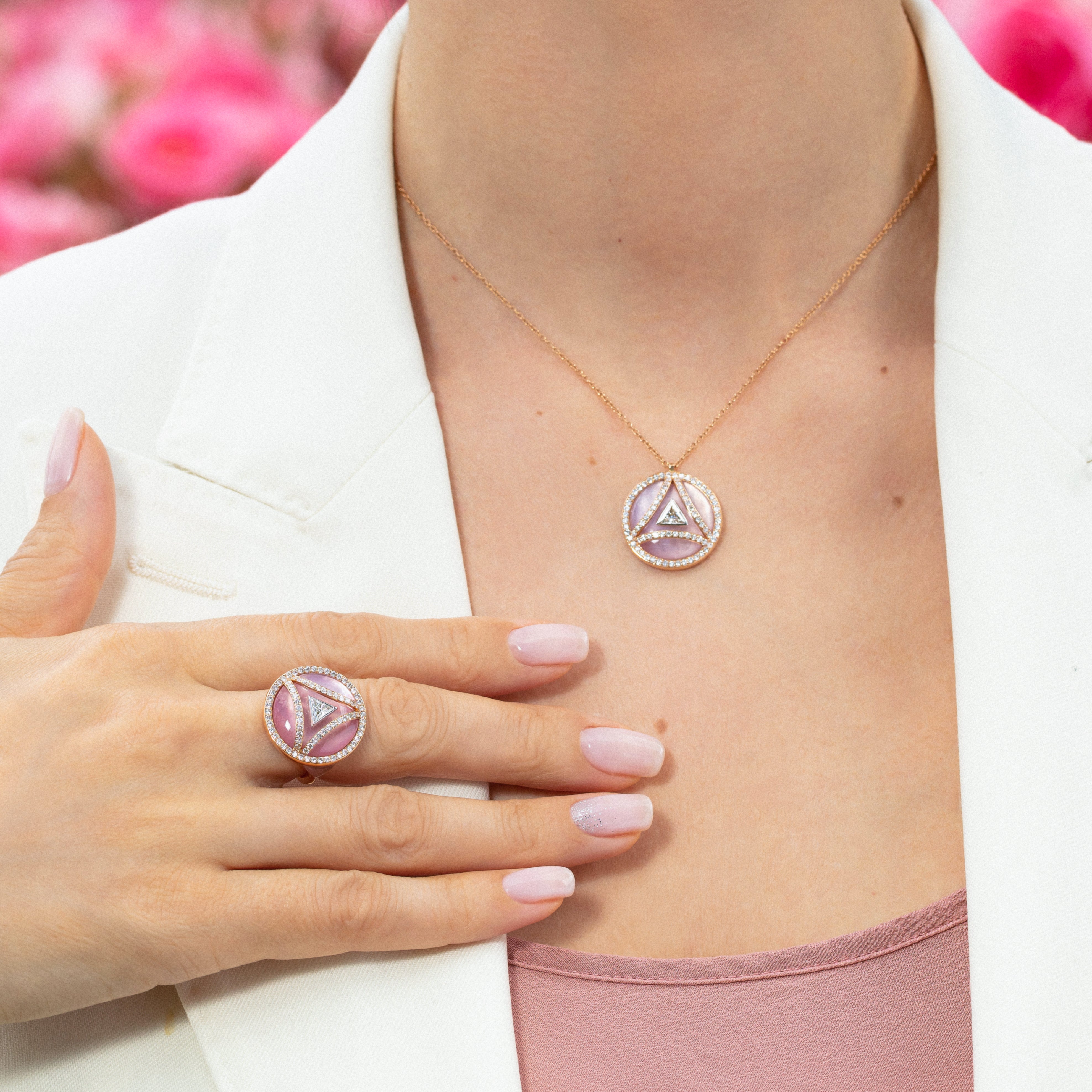 Dolly Mix pendant in 18ct rose gold, with delicate rose quartz and glittering diamonds, including one in our signature Maya cut. Each piece is named after a nostalgic, retro candy that evokes fond childhood memories.