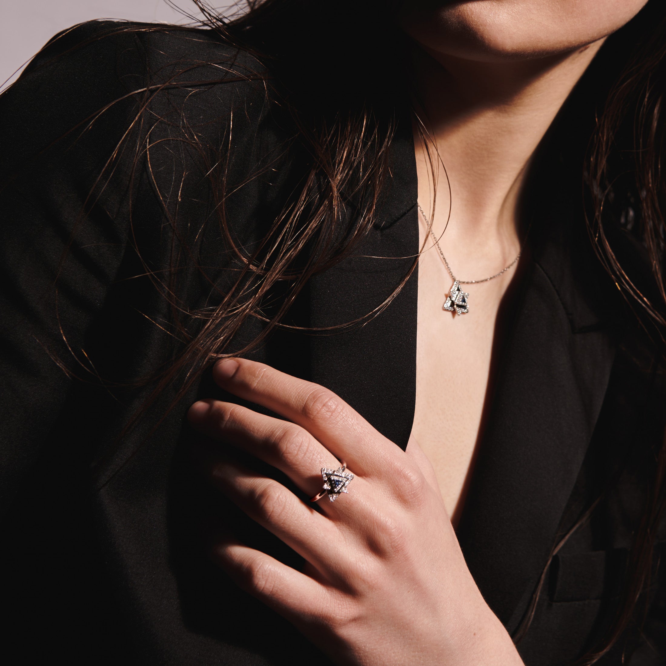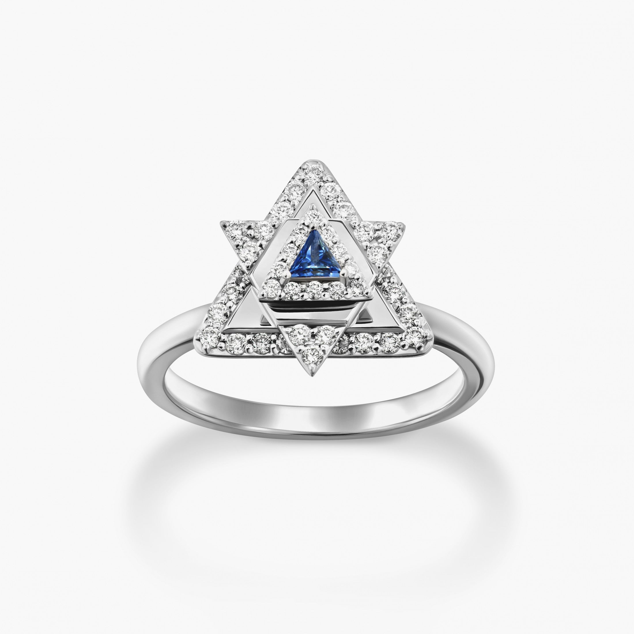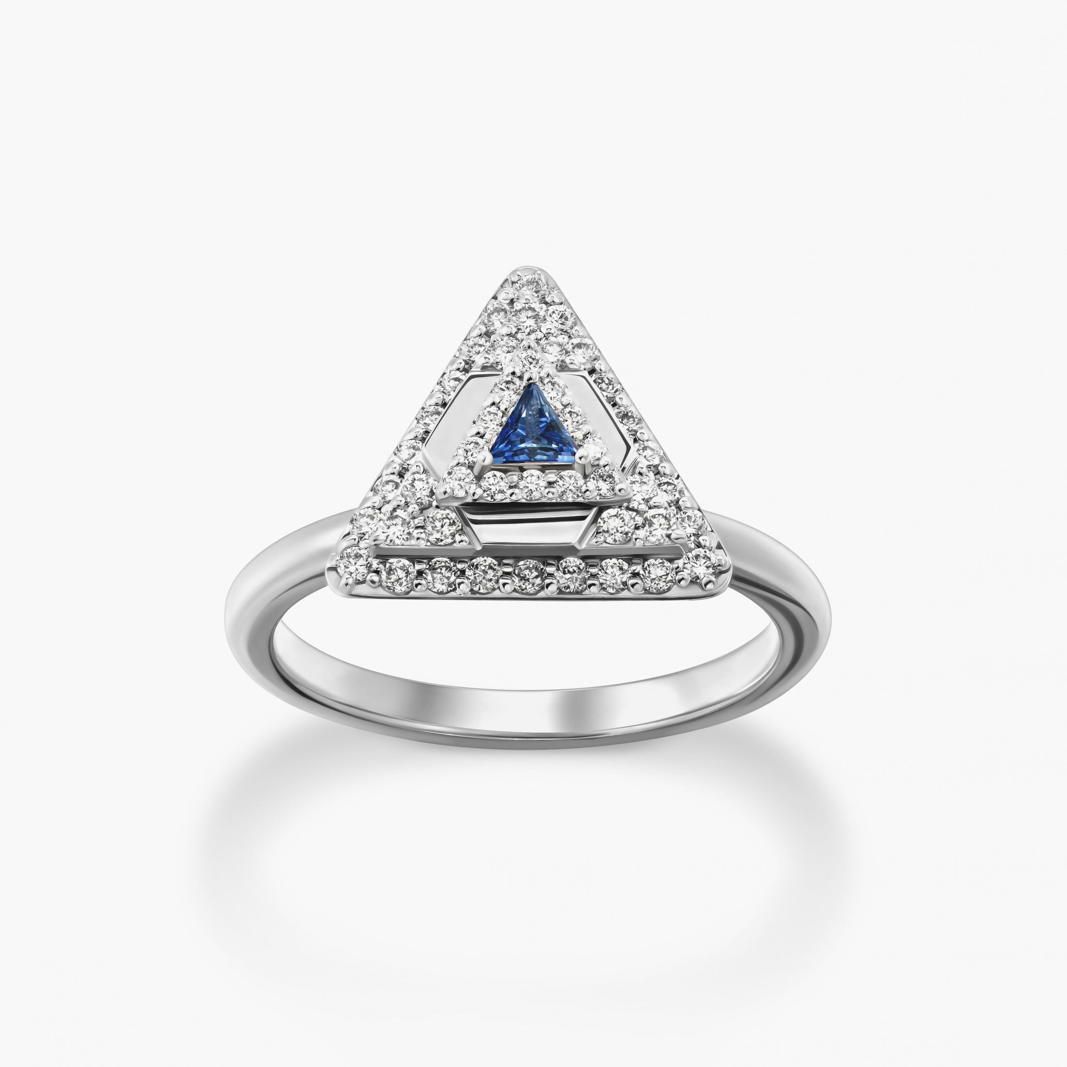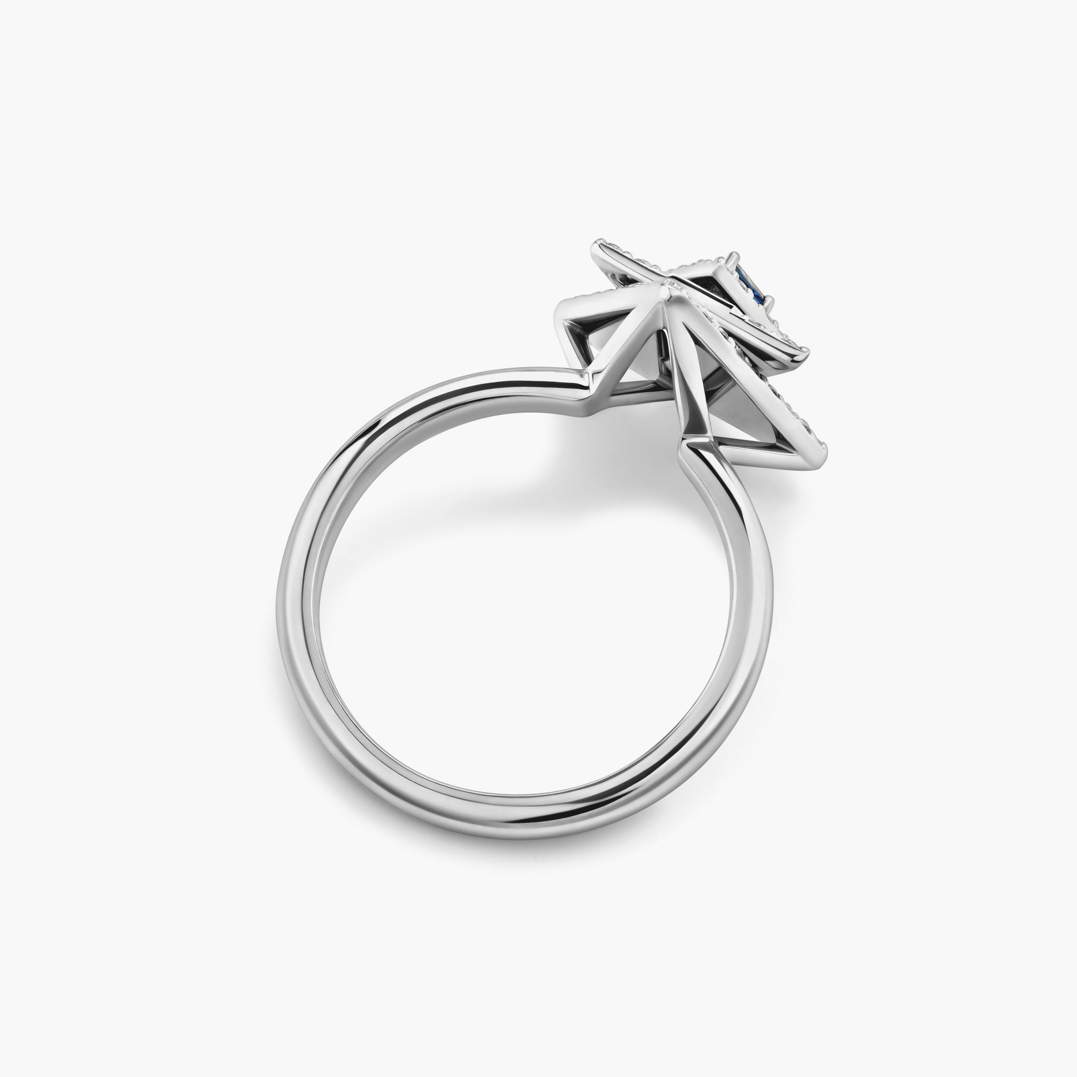 Composition: 18ct white gold, 45 round-cut diamonds 1 mm to 1.2 mm, Maya cut sapphire 3.5*3.5 mm